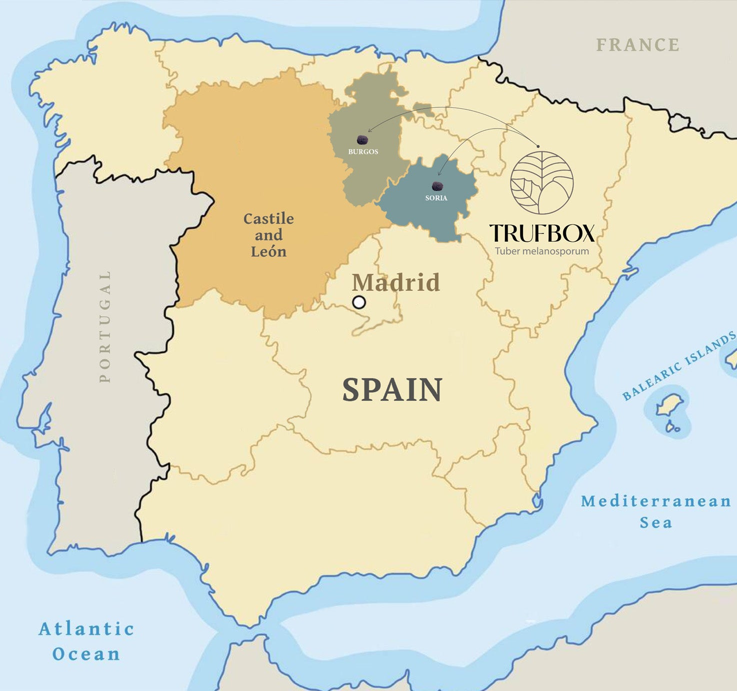 The cultivation of Tuber melanosporum thrives in the Castilla y Le贸n regions of Soria and Burgos, areas particularly suited for truffle farming. These regions benefit from a combination of favourable climatic conditions with cold winters and hot, dry summers, calcareous soils that offer excellent drainage and mineral balance, and ideal elevation levels. Additionally, the healthy average annual rainfall contributes to the thriving truffle mycelium. Both Burgos and Soria are nestled within the renowned Ribera del Duero, a Spanish Denominaci贸n de Origen Protegida (DOP) wine region on the country's northern plateau, one of eleven 'quality wine' regions in Castile and Le贸n.