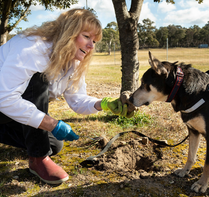 Oallen offers a microclimate and soil conditions ideal for truffle cultivation with favourable landforms (gentle slopes and elevated plateaus) and climate conditions (warm days and cool nights). The soil, a mix of sandy loam with some clay loam, is well-drained and alkaline rich. L'Air du Wombat was established and is run by Tricia and Rainer Kwast, ably assisted by their four dogs. Barry, an 8 year old Australian Kelpie has worked like a trooper for the last six seasons.